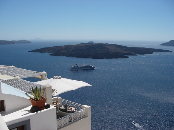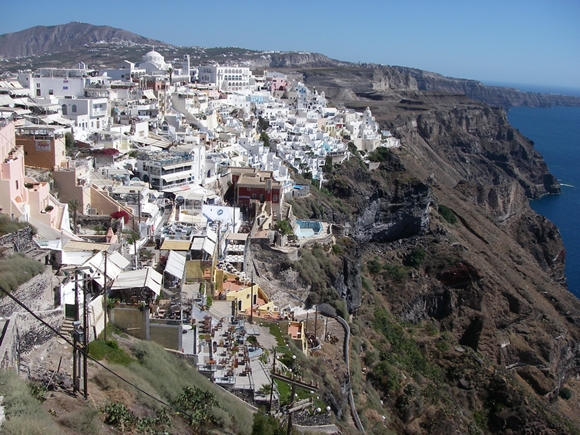 Op de tweede dag van het verblijf in de marina van Santorini (Dinsdag 24/7) zijn we 's middags met de bus naar de hoofdstad van Santorini gegaan, Fira genaamd. We wilden ook wel eens van de kraterrand naar beneden kijken. Honderden andere toeristen wilden dat ook. Het was er druk, erg druk.