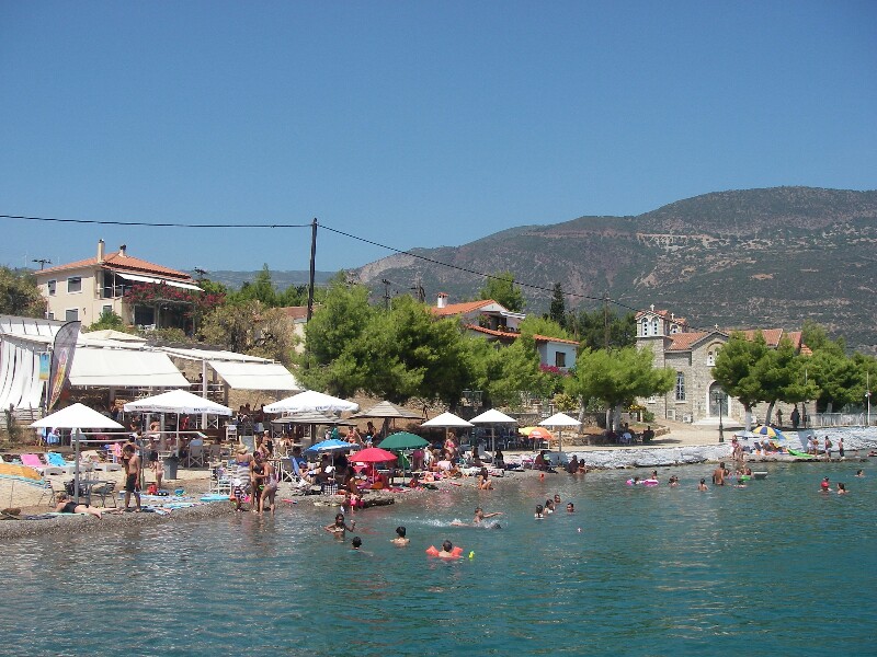 Het eilandje Trizonia ligt vlak bij de nnordkust van het vaste land. Er is een