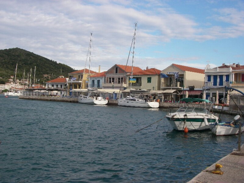 Op die zaterdag waaide het wel hard in de baai van Vathi, maar niet meer dan een 5/6. Het heeft wel de hele dag geregend.Aan het eind van de middag ging ik twijfelen of het anker wel goed zat (wel dus), en zijn we uit voorzorg langszij afgemeerd. Langs de kade lagen niet meer dan 6 boten.