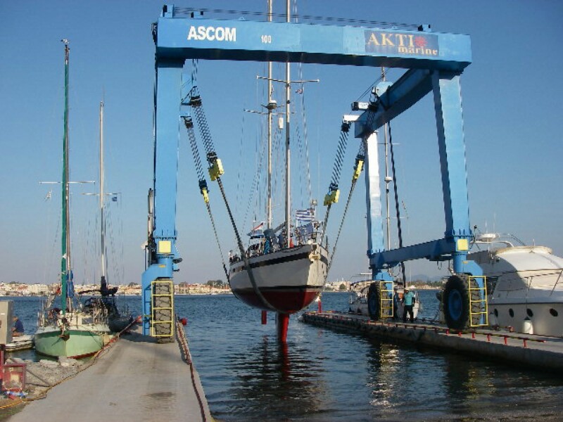 Dinsdag 9/10 om 08:00 vertrokken, want om 08:30 zouden we het water uit gaan. Toen we wilden afmeren bij Aktio marina lagen er 2 boten in de hijs kom. Die gingen al snel vertrekken en konden we afmeren en om 08:30 stonden de mannetjes van Atio klaar. Eerst werd boot in de hangbanden van de rijdende kraan gehesen, en daarna op de hydraulische hefwagen gezet. Ik vind het een omslagtige manier, want de hefwagen kan de boot ook uit het water rijden.