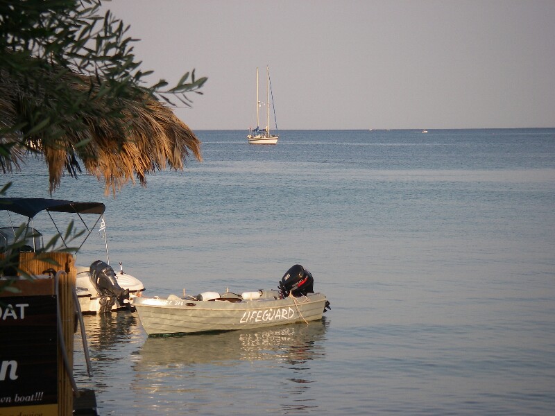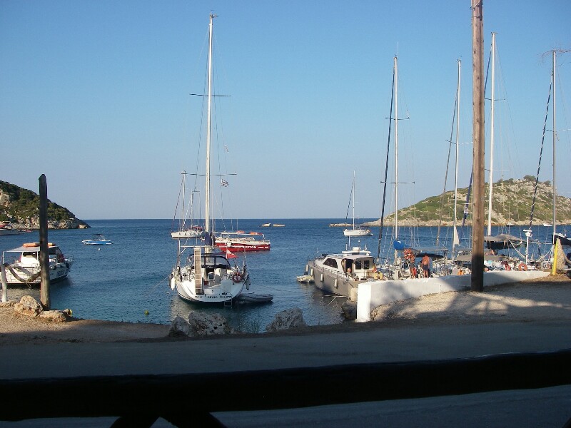 Zaterdag 18/8 even na tienen zijn we uit Nikolaos vertrokken om langs de westkust van Zakintosh naar het zuiden te varen. Dat is meer dan 30 mijl, dus 6 uur varen. Er stond weinig wind dus op de motor. De westkust is de wind kant van het eiland en heeft geen stranden, behalve in een paar kleine baaien. De kust is verder allemaal steile rotsen. Niet fijn om daar motor storing te krijgen. En dat is gebeurd met een klein vrachtschip, dat gestrand is op het strand van een kleine baai, en over de jaren steeds verder het strand opgestuwd is. Het is een toeristiche attractie: wreck bay. Vanuit Nikolaos zijn er boten die met toeristen naar het strand varen maar ook alle soorten prive motor boten en zeilboten. Met als gevolg dat de baai zo vol lag met boten, en het strand zo vol was met kijkers dat het wrak nauwelijks zichtbaar was. Je kan het beter op een foto zien als er geen drommen mensen omheen lopen.