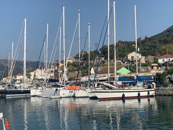 Maandag 26/7 om 10:30 vertrokken. De wind liet het weer afweten en op de motor langs Poros naar Eufimia op het eiland Kefalonie. Toen we de baai in voeren kwam er toch een windje, maar uit de verkeerde richting. Bij aankomst was dat windje toch 20 knopen en een lastige zijwind bij het afmeren. De haven meester heeft ons met het nodige schreeuw toch goed laten ankeren. Toen later de wind afnam lagen we als een huis met 60 meter ketting uit.