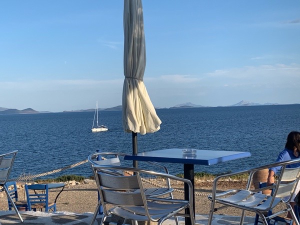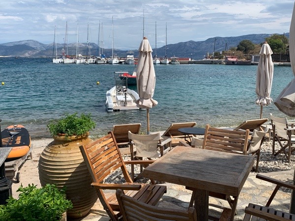Toen we dichter bij de vaste wal kwamen werd de zeegang vriendelijker.. We zijn in Kastos (op het eiland Kastos) gaan kijken of er plaats was, en die was er, dus om 13:00 lagen we afgemeerd aan de kade. Ook Kastos is zo’n haven waar het altijd vol is, en ik ben er, dacht ik, nog maar twee keer geweest. De oostenwind bleef ook ‘s avonds waaien, en we hebben een taveerne gezocht met een terras uit de wind. Hun slogan: the worst view, and the best food. Tegenover de taveerne lag namelijk een grote werkboot afgemeerd.