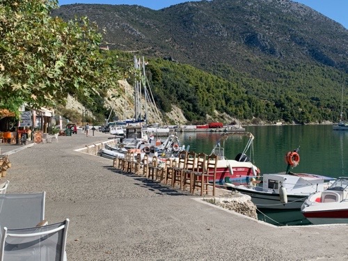 Op het menu stonden Chinese, Indiase en Thaise gerechten. Geweldig. Echter, die avond waren ze vol geboekt. Toen gereserveerd voor de zondag avond. Alle taveernes aan de kade waren behoorlijk vol, maar schuin achter de boot was er nog een met vrije tafels. De serveerster bleek een Vlaamse te zijn. Haar moer was Grieks, en ze werkte pas een paar weken in Nidri.