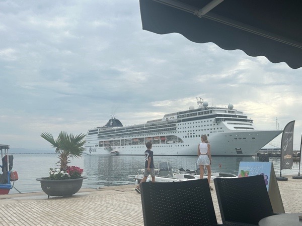 Er lag een cruise schip en een grote driemaster zeilschip aan de kades. Allebij met toeristen die een bezoek aan Olympia willen brengen.