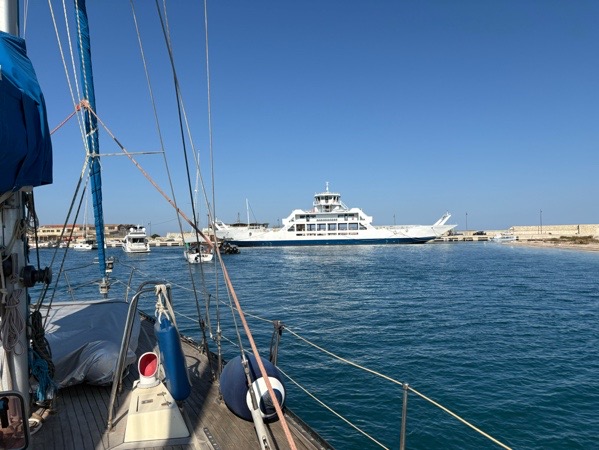 De overtocht is een uur. De kade is kort, dus het is zaak om op tijd binnen te zijn, maar ook weer niet te vroeg. Om 11:40 uit Kalamos vertrokken. Bij aankomst in Kastos was er weer veel veranderd. Een deel van de toch al korte kade is nu gereserveerd voor een veerboot. Ook lag er een dagtrip boot, maar ernaast was nog 1 plek vrij. We moesten wel 2 keer ankeren voordat het anker hield. Om 12:50 lagen we vast. Korte tijd daarna vertrok de dagtrip boot, en kwam er weer ruimte vrij.