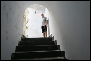 Pictures of the fort in a poorly state. Partially demolished in 1904, it was incompletely rebuilt in 1919. In 1991, following the order of General Leonardus Benjamin Moerdani, at that time the Minister of Defence and Security of Indonesia, the fort was thoroughly restored. The Fort: Fort Belgica is pentagonal in form. It consists of a low outer pentagonal structure and a higher inner pentagonal structure. A stair access on the southernmost wall of the outer pentagon provides the sole point of entry to the fort. The lower pentagonal structure is equipped with five bastions, from the left hand side of the access point: Galge punt, Moorsche punt, Leugenaar punt, Metaale punt, and Klokke punt, each equipped with a bartizan. The higher inner pentagonal structure housed several rooms which was arranged surrounding a pentagonal-shaped inner courtyard. A stairs in one of the room provide an access point to the top level. (A bartizan, also called a guerite or echauguette, is an overhanging, wall-mounted turret projecting from the walls of late medieval and early-modern fortifications from the early 14th century up to the 16th century. Most frequently found at corners, they protected a warder and enabled him to see his surroundings. Bartizans generally are furnished with oillets or arrow slits. The turret was usually supported by stepped masonry corbels and could be round or square.)