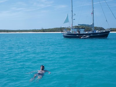 Have lost track of the date. Arrived yesterday morning in Elizabeth Harbour in the Exumas. To get there we had to closely follow the GPS and I was posted to the bow to watch for rocks or coral heads because the depths were no more than 3m and our keel is 2.2m. Entered by the western entrance which is wide. Crept up on Heimkher and we had a delightful evening meal with Bert and Marlene.