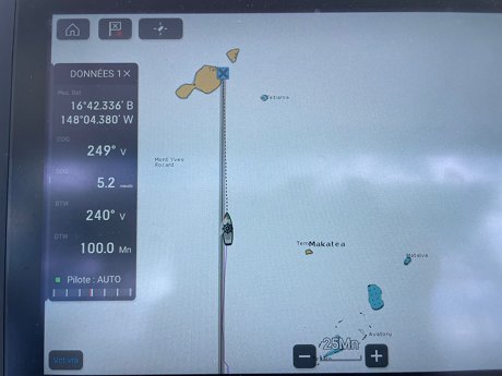 Lundi 29 mai 2023 Déjeuner puis dernière partie de snokling à Toau dans les Tuamotu. Durant la nuit le vent a mollit passant de 25 à 15 Nd; j’espère que nous aurons assez de vent pour notre route sur Tahiti. Ce matin l’eau de l’anse est très limpide nous permettant de voir une multitude de poissons ; nous avons même vu au loin des raies batifoler et une murène gardant, les crocs grands ouverts, sa demeure. Après notre snokling nous allons revoir le parc à poissons. Le nombre de poissons a considérablement augmenté et il y a un troisième petit requin à pointe noir. Il me semble qu’aucun poisson n’a été dévoré durant la nuit, ce qui me réconforte. Le Napoléon vit toujours mais tire d’avantage la langue, preuve d’un manque d’oxygène. Ni vu ni connu, je défais quelques nœuds du parc afin de créer une sortie., déjà des dizaines de poissons ressortent et retrouvent leur liberté !… Après un léger lunch et un briefing de départ, nous quittons la bouée avec facilité et sortons de l’anse Amyot pour prendre le Cap 242 avec comme objectif le port principal de Papetee à Tahiti. Malheureusement il ne nous a pas été possible de réserver notre place à la marina ce qui est regrettable. Ici c’est la loin du premier arrivé premier servi. Comme Ben du bateau Liberty est arrivé à la marina de la City il y a deux jours, il regarde pour me trouver une place. Également à Jean d‘A Plus 2 j‘ai fait la demande pour une réservation car il est dans un autre grand port près de l’aéroport, la marina de Taina. Le vent est d’est (15 Nd); nous nous mettons en papillon, génois et foc tangonés. Nous aurions pu partir tôt ce matin ou hier soir, profitant encore d’un vent soutenu mais d’une part, nous voulions éviter une grosse houle, peu favorable au mal de mer de Caroline et d’autre part il y a 220 MN entre notre mouillage et la marina de Papetee; pas question d’arriver de nuit dans une grande Marina que l’on ne connaît pas. En pleine navigation, en fin d’après-midi nous faisons à nouveau une partie de jass. Nous n’aurons jamais fait autant de partie de carte sur Brainwave depuis bien des équipages. Denis nous prépare des lentilles avec 3 morceaux de lard. Le lard acheté dans les marquises était délicieux mais un peu gras. A 20h00 les quarts de nuit débutent. Caroline prend le premier quart jusqu’à 23h00 puis moi jusqu’à 02h00 puis François jusqu’à 05h00 puis Denis jusqu’à 08h00. Comme skipper, je me tiens toujours à disposition d’un équipier si nécessaire. J’ai décidé de dormir a nouveau dans le cockpit afin d’être plus réactif. Vers 22h20 je me réveille sous l’effet de la pluie car il y a un gros grain et j‘aide Caroline pour les manœuvres jusqu’à 23h00 et là Caroline descend rejoindre François dans leur cabine et moi je reprends mon quart. Il y a de nombreux grains qui tourbillonnent dans toutes les directions. Comme les voiles ne se gonflent plus et cela devient compliqué de garder le cap de 242 degrés, j‘enroule les deux voiles et j’enclenche Obelix pour la suite de mon quart. Mardi 30 mai 2023 A 00h30 j’aperçois les feux d’un bateau de plaisance. Selon l’AIS c’est un bateau de tourisme de 95 mètres de long et 16 mètres de large qui fait route sur nous et au même cap que nous. „Blass de Brainwave répondez ? “: j‘ai envie d’identifier le chef de bord de Blass et être certain qu‘il ne dort pas. Quelques secondes après mon call, Blass me répond en anglais et nous échangeons quelques phrases. Il me dépassera sur mon bâbord ; sa vitesse est de 15 Nd. Je continue mon quart faisant des aller et retour entre le carré, le cockpit, le gouvernail, observant les instruments et l’océan à 360 degrés, essayant aussi d’écrire une phrase pour le blogue mais surtout luttant contre le sommeil… en effet je suis crevé et les mois de navigation s’accumulent. A 02h00 je réveille gentiment François pour son quart et lui résume la situation de navigation actuelle, puis je vais me coucher dans le carré m’endormant après 10 secondes. A 05h00 c‘est Denis qui prend son quart jusqu’à 08h00. Les quarts se sont bien passés sans trop de surprise. Malheureusement nous sommes toujours au moteur. Avant le briefing du matin, je prends connaissance de la météo sur le site WINDFINDER. Ce site gratuit est top ; il donne des informations pertinentes sur tout ce qu‘il faut savoir pour naviguer (direction du vent, vague, force du vent etc.) Avec une grande précision et avec une évolution de 3 heures en 3 heures. Les mauvaises conditions météo se confirment pour le soir avec un vent du sud de 4-5 BF avec des pointes à 28 Nd et une houle croisée de 3 mètres. Lors du briefing j’informe l’équipage de la prochaine météo mais comme chacun est bien amariné je ne me fais pas trop de soucis. Nous passons la journée à lire, jouer aux cartes et bien sûr surveiller notre navigation. Au pilote automatique Brainwave avance à 5,5 Nd; pas besoin d’aller plus vite car nous voulons arriver de jour à Papetee. L‘ETA prévu est 08h00 le 31.05.23. En fin d’après-midi la météo se dégrade peu à peu. Caroline nous prépare un Poulet de derrière les fagots avec sauce au curry et riz. Pas d’alcool pour ce dernier souper en mer afin de garder les idées claires pour toute la nuit. A 19h00 nous stoppons Obelix, le vent étant bien revenu. A 20h00, après avoir très bien mangé c’est le début des quarts ; le vent continue à forcir. Caroline et Denis débutent le premier quart mais malheureusement Caroline choppe le mal de mer et doit se coucher dans le cockpit vomissant tout le délicieux poulet. Il n‘y a rien à faire, que patienter d‘arriver à Papetee. François reste à ces côtés et Denis continue son quart seul m’appelant à cause d‘un bateau qui navigue en notre direction. Nous sommes au près serré avec uniquement le génois avec 3 