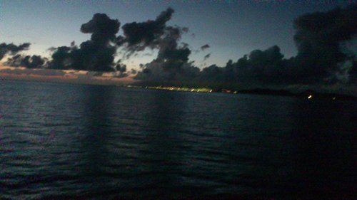 Almost calm, full moon above. Yet thunder aand lighning above land (port) and cumulus starboard