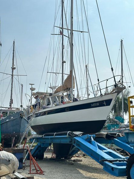 Someone had previously done a repair but had put the filler on over the top of an old layer of antifouling paint, so it hadn't stuck. We thought we were going to have to delay the launch but Islam, who does paintwork and fibreglass repairs in the yard, came