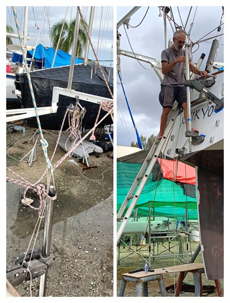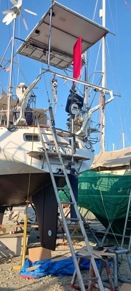 Phil completed the installation of the Hydrovane self steering, with a cats cradle of rope to support it while he attached the 3 brackets to the stern