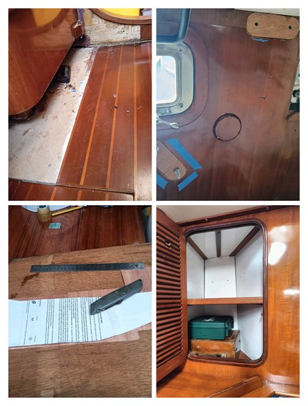 replaced damaged wood with white painted boards which give a clean, bright finish. In addition we have made shelves to make better use of some large lockers and dividers to stop things moving around when sailing.