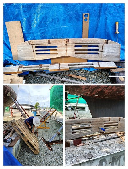 the existing boards but will do for now. Phil made and fitted teak pads to go inside at the stern of the boat to support the hydrovane brackets. We have been buying our wood from the wonderful Sim Lee Sawmill, a few miles from the marina, where we are so
