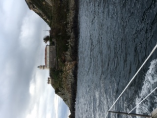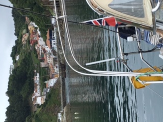 43:32.388N 7:02.214W We left Cudillero at 0800 (the fishing boats left quietly at 0500) after a very restful night on the mooring———an interesting arrangement whereby we picked up the “transit” buoy which was secured to a forward mooring stone by a length of rope that had a loop to go the forward cleat and a brick to make sure the line did not float. A separate line from the buoy ran astern to another mooring stone via another loop for the stern cleat and another brick. Very simple and very effective. The forecast was 15 to 20 knots from the north east and sure enough it blew from dead astern. The pole was deployed and with a double reefed main to port on a preventer and a poled genny to starboard we rocked and rolled to Ribadeo at about 7 to 8 knots.The wind increased to 20 to 25 knots for the last few hours so all in all an exhilarating sail after a day’s motoring on Thursday. Off to explore the town ——and the local wine ! Photos of Cudillero——not the best! ![]() ![]() ![]() |