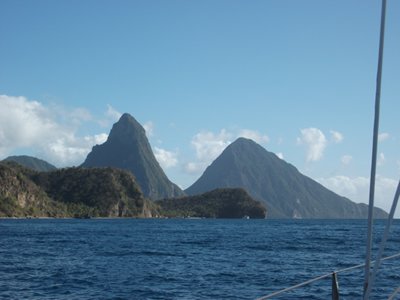 13.00.500N 061.14.300W The days and evenings in Rodney Bay Marina flashed by with lots of boat jobs completed, more discovered and various social evenings aboard different yachts. A great pleasure was to welcome “ Twilight” from her Atlantic Crossing with Rob Kiley and crew and that of course was cause for another celebration-- “Twilight” has wintered at Ardfern on 2 occasions! Friday we welcomed my God daughter Jess aboard “Moonbeam”- first time sailing in the Caribbean! Saturday midday we headed south and after a glorious sail took a mooring just North of the Pitons; it turned out to be rather rolly but still a stunning “ anchorage” ( anchoring is not allowed within the marine park ) and the snorkelling was excellent.