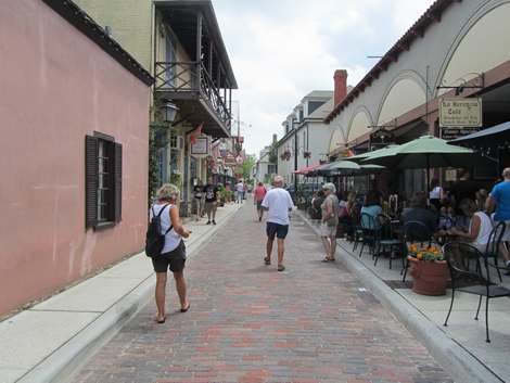 While having breakfast Jennie and Travis stopped by and said they were going to Stewart’s supermarket which was half a mile over the Bridge of Lions and was excellent for fresh food. As our food supplies needed replenishing we pricked up our ears and followed their example a little while later, only to have to wait while the bridge was raised for some river traffic. Jennie and Travis were right, we bought some excellent steak, chicken breasts, fruit and vegetables and some bread. On the way back to Moorglade the strong currents swirling under the bridge were noted, we were close to a sea inlet and the tides were stronger here. After stashing away the food we headed for the town. Information picked up told us that the city had existed for 444 years and has the longest chronicle of any in the USA. It was founded in 1565 by the Spanish who held it for almost two hundred years despite various skirmishes along the way with the French and the English, including an attack by Sir Francis Drake in 1586. The English eventually gained control in 1763 after the Seven Years war for a brief period of twenty years, when Spain gave up Florida to gain control of Cuba. The second Spanish period lasted from 1784-1821 following Spain’s involvement in the American Revolutionary War. Spain finally handed control to the United States in July 1821 and the Americanisation of St Augustine started. Today the centre of the city has become focussed on tourism, the old streets are full of memorabilia shops, cafes, bars and restaurants, ghost and pirate experiences, train and trolley rides round the old town, sailing ship and catamaran trips around the bay. We started our experience with lunch in a cafe in the oldest street in town, next came a museum in a house that had housed a convent where black children had been educated and where there was an interesting herbal garden. A walk through the streets took us past old wooden houses, large twentieth century buildings, originally hotels, now housing the Flagler College and the Lightner Museum and the Cathedral where we just saw the tail end of a very elegant wedding. The weather forecast a storm for the evening at 19.00 hours so plans for socialising were put off until the following day, we ate on board and were treated to a firework display in the late evening as it was the cathedral fair. The next day was spent further exploring the town with considerable time spent at the Castillo de San Marcos, the old fort which had guarded the town since the seventeenth century. A cannon was fired at regular intervals and we watched as a group of four men dressed in eighteenth century military costume marched through the fort to the top level and went through the procedure for firing the cannon. We were told to cover our ears at the point of the explosion, it was a timely warning. Other points of interest found were the old city gates, the cemeteries , the Zero Milestone which marked one end of the Old Spanish trail which led from St Augustine to San Diego in California and last but not least the Old Drugstore with pharmaceutical history, traditional infusions [that smelt like manatee breath according to Kay] and wonderful ice creams! On the nature front two points of interest, just after mooring a turtle was seen exploring under the pontoon next to us and while walking off the pontoon some strange black balloon like creatures looking like the corners of a swollen black plastic bag were noticed among the weed. It turned out these were Portuguese Men of War. The evening was spent enjoying a ‘real’ American meal with Robbie and Jenny and John and Travis at the Gipsy Cab Co, most of the party chose steak while Kay was more adventurous with shrimps and grits. As there was an early start next morning we said our goodbyes, Jennie and Robbie were due to go to Bermuda and then back to the UK, John and Travis were continuing along the ICW after having their engine fixed.