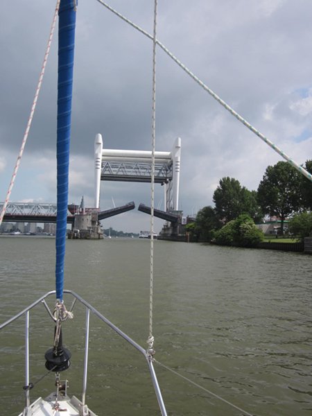 Our position is 52:00.67N 04:41.559E Distance covered 32.7Nm We had allowed 3 hours to motor the 13.5Nm from Willemstad to the road & railway bridge at Dordrecht, which has restricted opening times, so we left promptly at 10am. However we had not allowed for a strong tide sweeping us along in excess of 7 knots so in spite of having to cross a channel busy with commercial traffic, we arrived at the bridge in perfect time for the opening an hour earlier than planned, at 12.12.