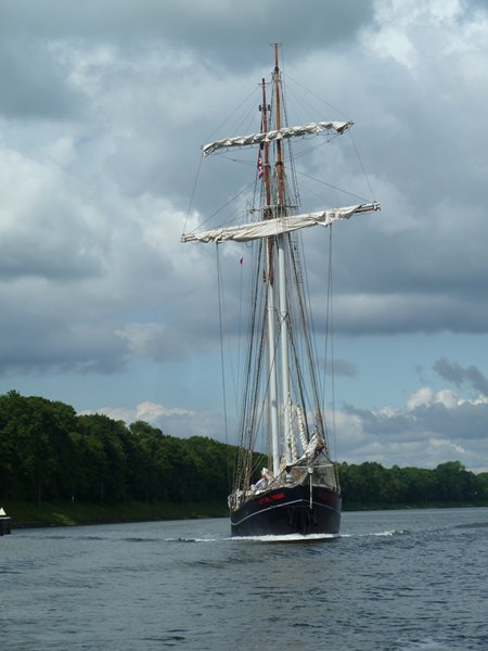 Our position is 54:23.98N 10:12.71E Distance covered 21Nm We were anxious about finding a berth when we left the canal, as we had discovered along the way it is Kiel Week. Ina and Gerd had given us details of a berth reservation in Laboe they had made but were not now planning to use, so we telephoned in the morning to see if we could have the reservation transferred. However this proved impossible as both the harbour and the marina denied having any such reservation but they both stated that if we got there before 15:00 then they should be able to accommodate us so we set off immediately, just after 9am. In contrast to the day before, the weather was reasonable and the canal seemed empty without any large traffic apart from a square rigger, Wylde Swan, which motored past us, presumably heading for Kiel Week.