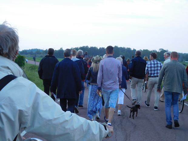 20:15 saw us cycling down to the village again to join the group walking from the town out to the pole site. Everyone looked festive and the young girls had wreaths of flowers in their hair. At the pole the final touches were being added and people were coming in from all directions. We were issued with a song sheet – in Swedish and we didn’t know any of the tunes – and chatted to other sailors from the harbour and also English speaking locals.