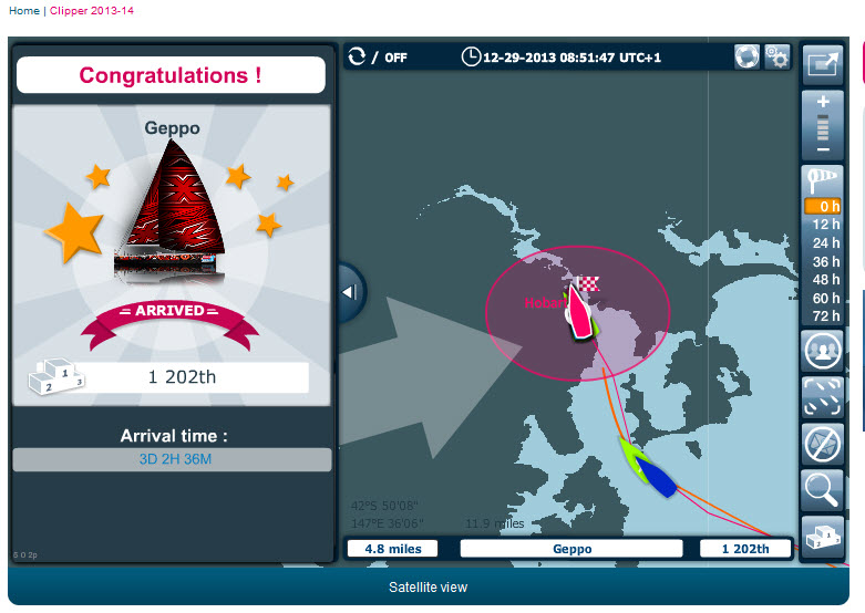 Geppo si aggiudica anche la famosa Sydney-Hobart (rolexsydneyhobart.com/) tenendo il lato sinistro del campo di regata, e ottimizzando al massimo velocità e angolo, dopo una partenza incerta, si piazza al 1202 posto.