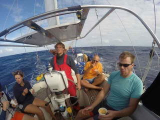 The thing with the boat is it never stops. Someone is always at the helm and all other activities revolve around that. Although we have an electronic autopilot, we choose to to use under sail, because: (a) it uses a lot of energy from our limited battery reserves and (b) our sailing is downwind - almost precisely with the wind behind us - and the autopilot struggles to hold an accurate course in the 1 - 3 metre ocean swell we are in. We congregate as a group as much as possible and always eat together with someone stepping in for the helm when they have finished. Meals are in plastic bowls with a spoon usually. They always look appetising and taste yummy. L-R Will (half of!), Ali, Sven, Chris, Anthony.