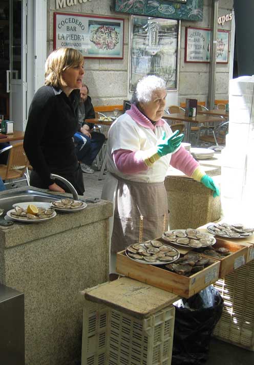 The ferry runs half-hourly across the Ria to Vigo, about a 15 minute trip. We went across on Tuesday, and spent some time exploring the old town, including climbing up to the top of the O Castro hill, which at 136m above sea level gives a fabulous vantage point over the town, and over the Ria out to the offshore islands. On the way down we took a slightly different route, passing some rather fierce looking ladies sat on chairs outside their houses, but eventually got back to the Pescaderia with its collection of shellfish restaurants spilling out onto the pavement.