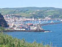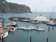 to the rock armour boulders on the end of the inner harbour mole. After breakfast we got the working jib out of the sail locker where it had been crudely stuffed the previous evening, and folded and rolled into a sensible size, so that we could extricate the inflatable dingy. Before inflating the dinghy to get ashore, I radioed the harbour office to ask if there were any developments that would allow us to berth along-side for diesel, and the harbour master asked us to wait 30 minutes as a couple boats were leaving and he was going rearrange things to make us a space. The man was a hero: we moved in and tied up; meanwhile he had ordered 80 litres of diesel to be delivered in cans and, while we waited for this to arrive, a charming lady police officer, seemingly not older than about 12 years (we are getting old) checked our passports. The police officer was impressed that I could give the boat dimensions in Portuguese numerals which are about the limit of my Portugese. With fuel and formalities completed, the harbour master, a retired yacht delivery skipper, drove us to the supermarket to shop. On the way back to the harbour we could take in our surroundings – a beautiful, unspoilt island very reminiscent of some of the remote Hebrides. Walking down the hill we found a restaurant/bar for a late second breakfast followed by an early lunch. Everyone, from the harbour staff to the police and other customers in the bar/restaurant, were so genuinely friendly and helpful. Leaving at