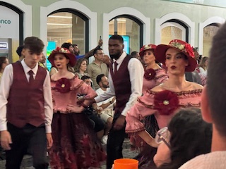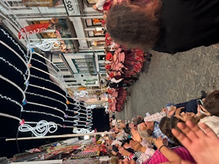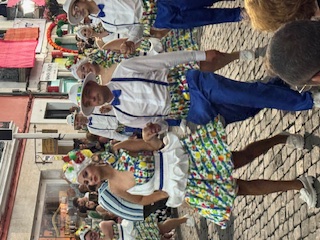 The town was buzzing, all of the route lined with people sitting on camping chairs, people hanging over balconies, waiting in anticipation. Grabbed a beer, found a space, luckily behind a couple of Americans (moved to the Azores many years ago), able to tell us more about it. Over 30 groups, dancing and singing this evening up and down the 2km cobbled route, each accompanied by a brass band. Goes on til 5am. Bands in short supply so some have to play for a couple of different groups- exhausting.