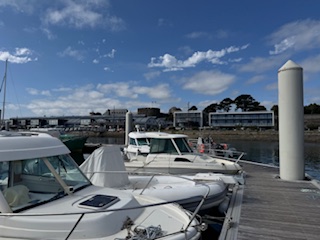 The Marina du Château shares an outer entrance with the major French naval base. Just as we were approaching, getting fenders and mooring lines ready, a navy escort craft came screaming up to us to forbid us from entering. Looking round, realised a rather modern naval vessel was approaching which then proceeded to fire its canon numerous times in close proximity. Hearing will never be the same!