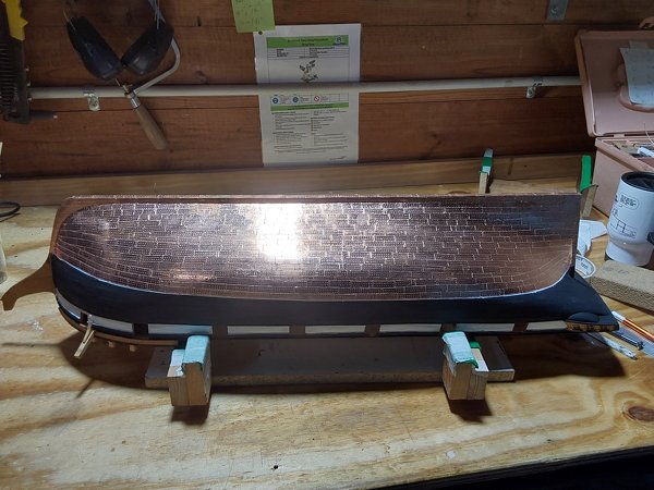 Here are some photos of my model. Currently I am working on coppering the hull below the waterline. The starboard side is complete and I am now working on the port side.