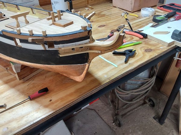On the brig-of-war side, I have completed coppering the hull and have now turned my attention to the bow with its complicated trail boards, cheek pieces, figurehead, and other bits and pieces I know not the names of. This work has been slow and fiddly but it