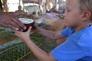 On the 3rd of June we hired a car and drove through the Northern part of the Vava’u Group, on the island of Neiafu. The only car that Avis had left to rent was a pick up! Two seats in the front and the rest in the back. Alex and Inez were very quick jumping onto “their” seats. ![]() We first stopped at this little village right by the sea called Nga’unoho. Alex and Inez had emptied more of their toys, pencils and paper and we were searching for a school where we could give away to children who needed this more. And that is when we found this school of 2 classes: one class for children 4 - 6 years and the other class for children 7 - 11 years. Seeing us walking through the school yard the headmaster welcomed us and … … introduced us to the first class. ![]() The sight driving further through the landscape and the villages of the Vava’u Group. All English speaking islands are still inspired by the British influence, although Tonga was never colonised, considering school uniforms. A quite nice sight along the roads. ![]() We headed to the Botanical Garden where we had lunch and where Alex lots his second tooth! After lunch we visited the Botanical Garden being one of the biggest attraction of the Vava’u Group. If missing on insect repellent, the Garden offered a more natural way to keep the bugs away. However for the smaller ones these became more of a chasing weapon… We had a very interesting walk with this man who has devoted his life to this garden and passionnaly shared every bits and pieces of “his” garden. These fruits below are the Nooni fruits growing everywhere on Tonga. This root is the source of red curry. The next pictures shows how they finance the Botanical Garden. Just like sponsoring, companies or organisation get some paths named after them for 2 years. Here the King has financed this path. Vanilla! We learned that vanilla is growing from an orchid. After the lovely walk in the Botanical Garden we were shown how the Tongan people use their natural supply to weave baskets. With the same palm leaves they also make doors, roofs and shutters for open windows, all depending in which width or breadth they use the weaved leaves. From the same trees they showed how much they can extract from the coconut. Alex is tasting the natural coconut juice…. …. and then with the coconut flesh mixed with water they make the coconut milk that we buy in cans. A girl dressed in typical Tongan dress made out of the palm’s trunk. We continued our tour to the Northern part of the Vava’u Group, the ‘Utula’aina Point. And what a stunning view! ![]() More pigs everywhere. We soon learned that although it looks like the pigs are walking in the wild, they belong to people. The pigs don’t run away and keep quite close to where “home” is. Our last stop was Mounga Talau looking over Neiafu. |