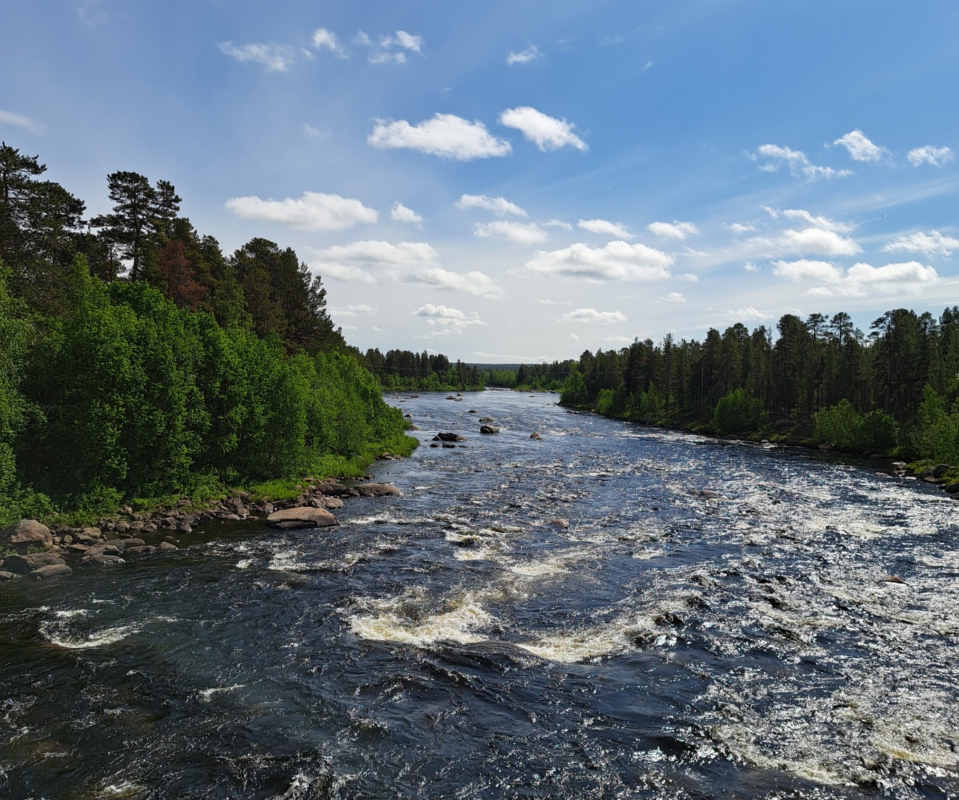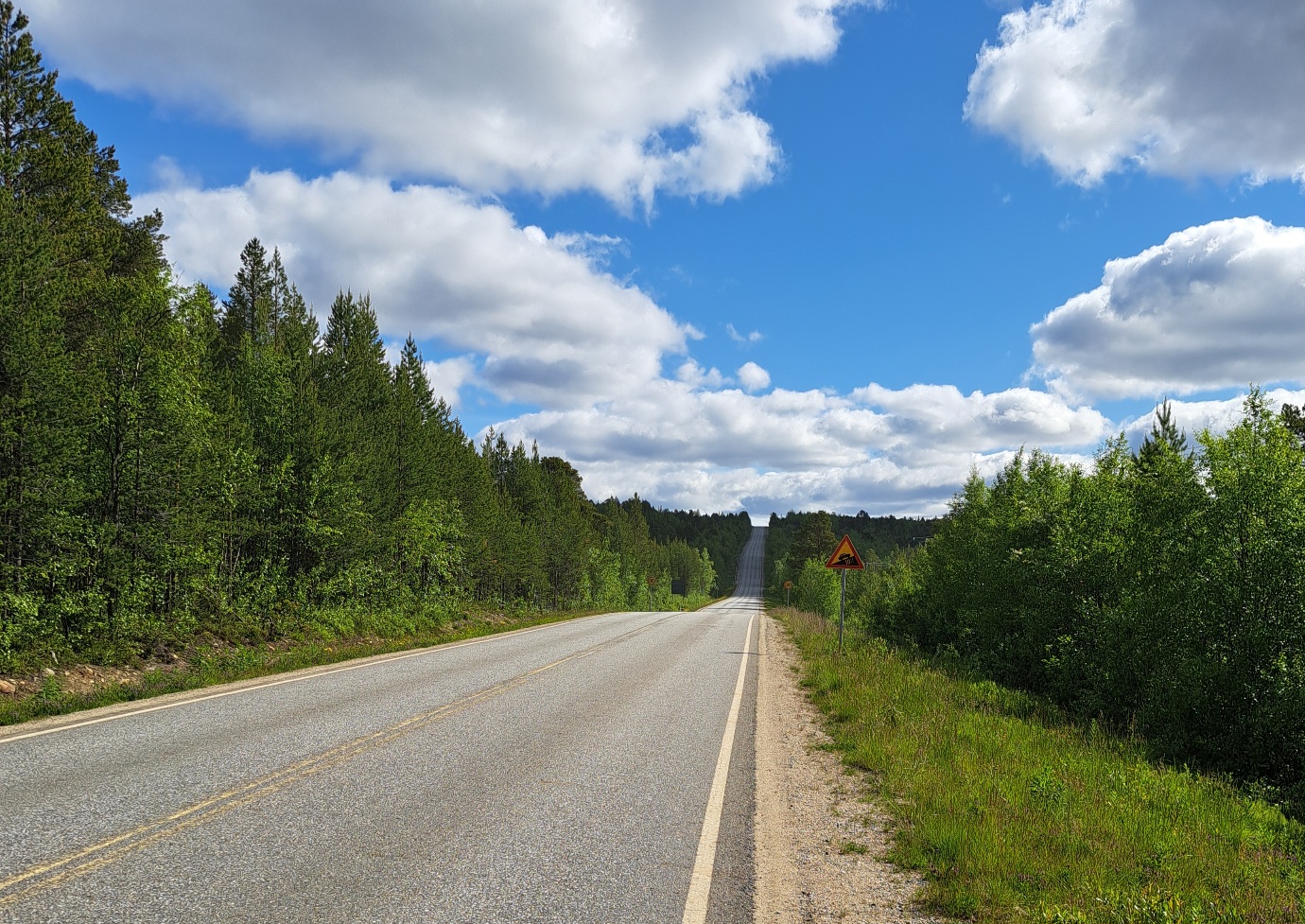 landschaftlich hat sich heute nicht viel geändert. das wetter ist aber besser geworden und etwas rückenwind hat mir auch noch geholfen. für die 117km brauchte ich bloss 5 stunden und 15minuten. habe mehrere male rentiere angetroffen, aber jedesmal wenn ich die kamera zücke drehen die viecher mir den hintern zu. heisst wohl: "du kannst mich mal". das bildchen von der strasse habe ich kurz nach dem grenzübergang nach finland aufgenommen. es steht symbolisch für die ganze strecke.