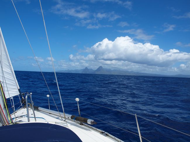 We left Bequia after a fantastic month long stay in the St Vincent Grenadines. It’s a nice area – none of the islands have the spectacular hills and rain forest of the larger islands further north, however – the islands are all really small, and quaint with some beautiful unspoilt bays, there are no large, all inclusive hotels in the Grenadines and no big shops – best of all – Jet Ski’s are banned entirely for St Vincent and all its’ islands. We had some great walks in the woods in Union and across from the west to east of Bequia and around Mustique. The Tobago Cays are beautiful – a huge lagoon surrounded by a barrier reef, and we managed to do some great dives in Bequia over Christmas. NY Eve at Basil’s in Mustique was a good choice – live music and fireworks on the beach.. However – it was time to leave and press North to St Lucia. We didn’t visit St Vincent since, although you get mixed reports – it’s not considered somewhere you can leave the boat unattended without risk of things going missing. I would have liked to have climbed the Volcano, maybe another time – there are so many places to see. View of the striking hills of St Vincent as we sailed by in the early morning