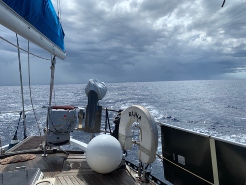 Woensdag 30/8. Om 10:25 vertrokken met bestemming Nicolaos, in het noorden van Zakinthos. Toen we kaap hadden gerond en naar het noorden koersten zagen we een dreigende lucht hangen. Een snelle check op de weerberichten liet zien dat een bui van noord naar zuid trok, recht op ons af. De kuip regenbestendig gemaakt ( alles wat niet nat mag worden benedendeks gebracht) en de buiskap op gezet.