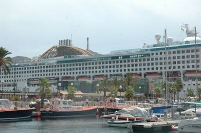 Cartegena where we are moored alongside the main town quay. There is a cruise ship in town too which towers above the
