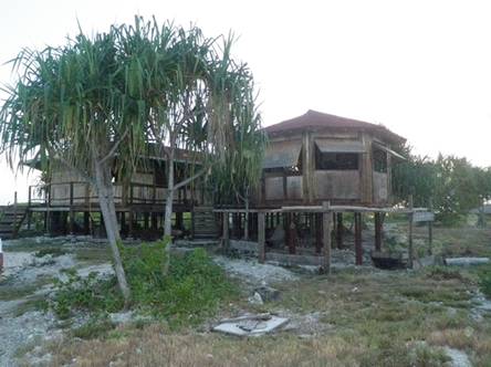 hexaganol buildings, one is the living area and the other the kitchen all built On stilts to survive any flooding when it is cyclone season.
