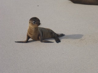 The wild life here is quite exceptional and it is an inspiring place - a few too many trippers, like us, ad this will of course get worse so we are probably just in time - the scheduling of boats and snorkel trips and walks is well done but we have ‘collided’ with other groups occasionally. We dived with a seal pup just like this one - unbelievably fun and fast and elegant under water. Explorers extraordinaire Will and Janine toughing it out on North Plaza island. Vicky at the famous post office barrel on Floriana Island. There is a wonderful tale of romance and possible treachery with a German Baroness and her three lovers and a dentist and his wife on Floriana - they all planned to live the prefect idyllic life on the island but then disappeared in total mystery - a daughter is left and still lives in Floriana and owns the one small hotel but she will not talk about he demise of her parents or any of the history. The post barrel, according to our guide works rather better than Ecuadorian mail!!! |