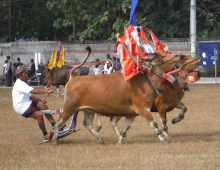 who steered the bulls via ropes through the bull’s nostrils. The teams had to run from one end of the