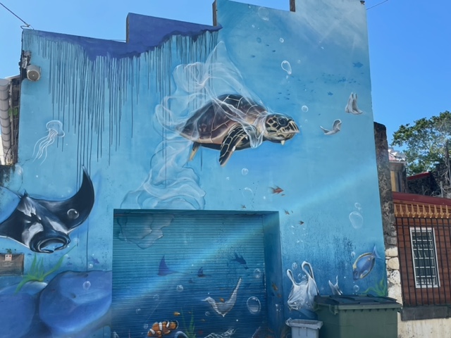 There were a few murals depicting marine pollution, this turtle has plastic around it!