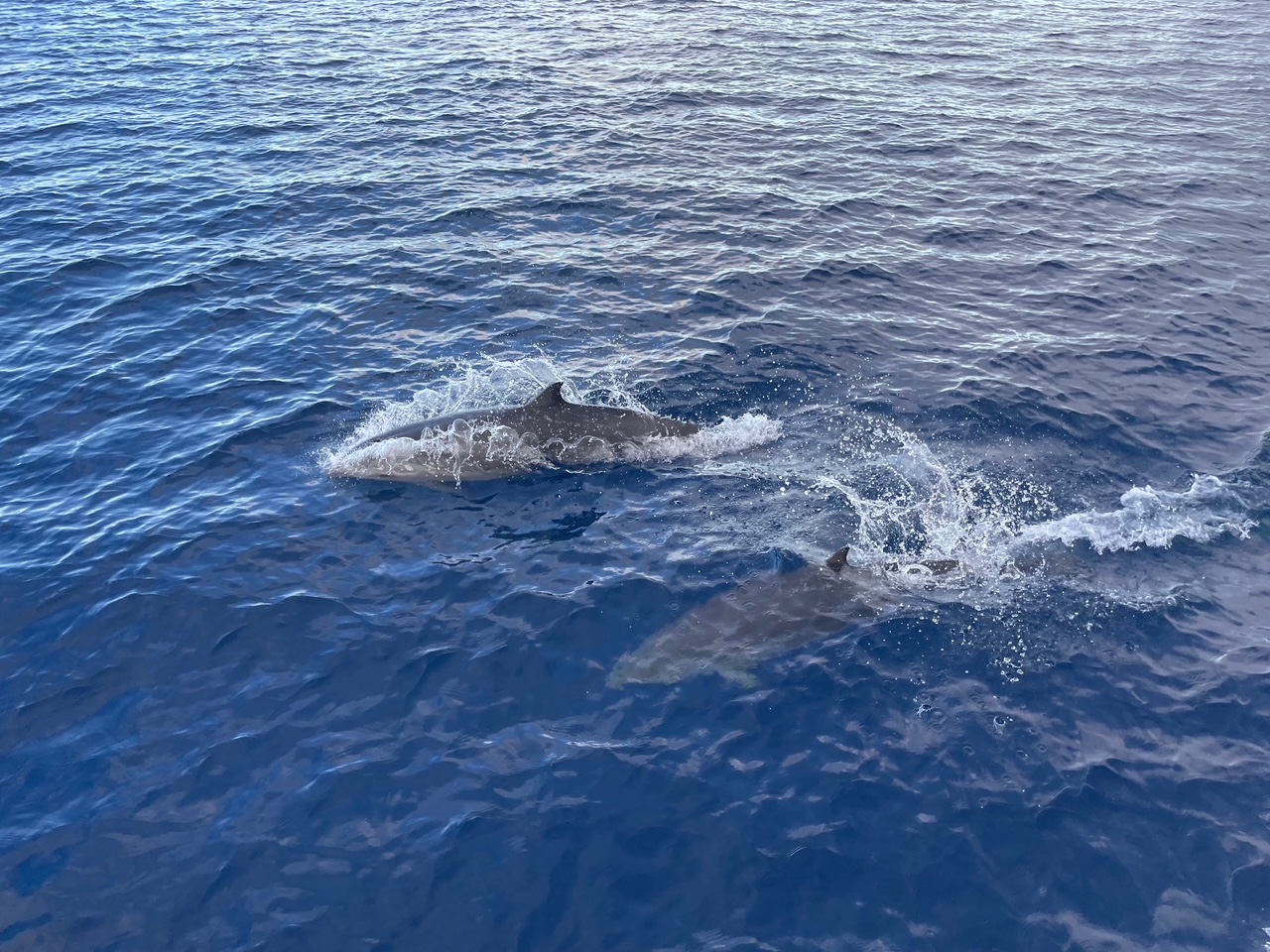 As expected there was a wind shadow when we left, to compensate for having to motor for a while we had a fantastic dolphin visit, the largest pod since we were in the med were playing and fishing, some chose to join us for a while while others continued to fish. I mainly videod them as I usually miss them in photos. They were a delight with possibly 2 different types of dolphins swimming together, mostly they were definitely striped Dolphins but there were a couple which were significantly bigger and had different beaks although I don’t seem to have caught them on camera to try and identify them 🙄. There were mums and babies as well who always stay slightly further away from the boat to protect the babies.