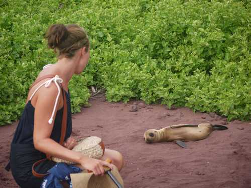 The wake up call came over the tannoy at 07.00 announcing that breakfast would be served at 07.30. We'd then have an hour to eat our breakfast and get ourselves ready for disembarking at 08.30. The Captain Patricia (a male) had motored north in the night to an island called Rabida. Today we had a wet landing, this one really was wet as it was off the dinghy into the sea, onto a volcano formed red beach. There was a tiny 2-3 week old sea lion pup there to greet us which was spectacular. The guide told us that he was very thin and was likely to die as his mother was likely to have been eaten by a predator whilst out fishing in the sea. However, we'd like to think that that isn't true. We did see him through the binoculars later on with other sea lions so we're hoping that his mother was just out fishing and she had returned - that's what we're deciding happened anyway, it's a much happier ending.