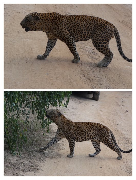 the leopard walked across the track immediately in front of us and stopped to examine the bushes!