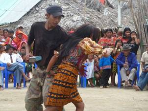 09:26.01N 78:31.64W We sailed to Isla Tigre, a Kuna village close to the mainland. On the 25th of February every year Kunas from the neighbouring islands gather here to celebrate the independence from the Panama government after the revolt in 1925, called the Tule Revolution. Kunas were persecuted and brutalised to give up their traditions and believes in the name of progress, education and integration, but they stood up for their culture and are today one of a few Indian Ethnic groups living in freedom and autonomy. The chiefs decide on the rules and every day the community meets in the ‘congreso’ to voice and hear about village and community matters. Traditional Dancing, notice the girl with the long hair and no beads on her legs. At puberty girls go through the ritual of receiving their Kuna name, having their hair cut short and decorating their legs with beaded strings. The whole community (and visitors) are present to honour this ‘right of passage’ in the chicha hut (the celebration hut; chicha is a fermented cane sugar drink, slightly alcoholic and drunk on special occasions) With modernisation, not all girls cut their hair but until puberty, girls are called by a nickname. Kunas are friendly and accepting to foreign visitors but foreigners will not be able to settle in Kuna Yala. All businesses, restaurants and hotels are run and owned by Kunas, who are free to leave and live a more western life in cities, they will be excommunicated but tolerated for visits. In Tigre for example, Kunas are not allowed to visit and board yachts. Yet away from their village working on the outer islands there is more freedom and we enjoyed our Kuna visitors.