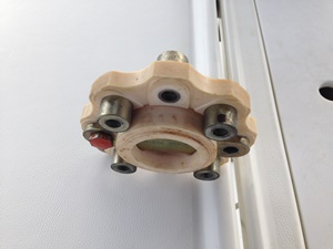 Back in the water, the alignment was checked and the engine run in gear. The whine was less, but not gone, while the back of the engine and gear box were vibrating as badly as before. So the shaft and gear box were disconnected again and the Damper disc removed (this is the bit between the gear box and the engine which takes up the pressure when the yacht is put in gear). It was rusty and worn and the springs were loose, but this was reasonable wear and tear really while nothing was obviously broken or wrong. Anyway we ordered a new Damper disc which was delivered and fitted in 24 hours. When the engine was run in gear the whine and rattle were gone but the gear box was vibrating as badly as ever.