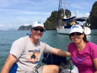 08:04.075N 098:26.739 E Few people we know would, I suspect, choose to spend their 25th wedding anniversary on Tashi Delek, but our dear friends Laurie and Sonia from Australia did just that! We met Laurie and Sonia, together with their three children Travis, Beau and Kara on their catamaran Moana Roa in the Galapagos Islands. We then sailed across the Pacific pretty much together all the way to Bundaberg in Australia. It was a real delight to have their company in so many special locations and to watch the three children growing up along the way. From Bundaberg the Moana Roas went south to Sydney where they eventually sold the boat, having bought an SUV, camping gear and a trailer and driven overland back to their home outside Perth. We have kept in touch since 2014 and were so pleased when Laurie and Sonia took up our offer of a break away from work and children on Tashi Delek in Thailand. We had a fabulous 5 days together, sadly without Carol, but it was so much fun to have fellow cruisers on board who just slotted straight back in to life on a yacht and knew instinctively what needed to be done and just got on and did it. We visited a couple of island hongs, drank lots of wine, ate great local food, talked constantly about the Pacific as well as catching up on jobs and families. We even managed to get some sails up, jam the genoa furling line and sit out a short squall alone on a mooring buoy in Koh Hong as all other boats fled! On 2 March Laurie and Sonia flew to Singapore for a couple of days luxury on their own, but as Mike was also going to stay with Will, Annie and the grandchildren in Singapore on 4 April, we all met up for lunch in China Town. Mike particularly wanted Josh, Dan and Isla to meet the inventers of the Moana Roa swing (photo in the first blog entry for 20 Feb) and the tellers of tall tales such as “Drop Bears” and “Hoop Snakes”! True to form Laurie was able to show the children videos of even more outrageous stunts for them to try when they are next on board Tashi Delek! Thanks Laurie!! Again, as in Bundaberg, we did not say goodbye as we just know we will see the “Moana Roas” again, hopefully on Tashi Delek next year, or in the future in UK or maybe even in Perth?