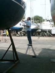 Richard changed the large anode that protects the engine and then polished the sides of Pyxis just above the waterline where we have a blue stripe so she is looking a bit smarter now.
