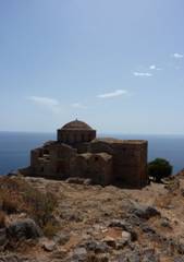 Behind the village is a steep, zig-zag footpath winding up the side of the hill, past numerous small buildings and old churches, through a tunnel (a rest in the shade is required here) into the ruins of the fortress and then on again to the summit. At the very top of the rock that is Monemvasía there is an old Venetian citadel and a church, Ayia Sofia, which sits on the edge of the cliff on the north side.