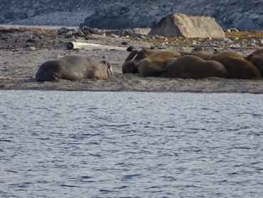 walrus colony, some wallowing on the shingle and one in the water. As we